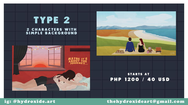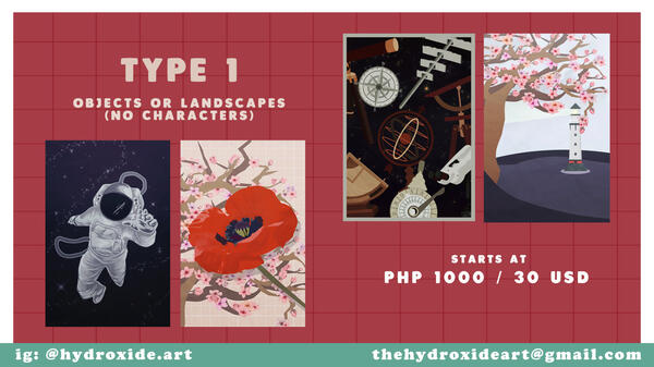 1. All rates are base prices and are subject to change.2. The artist still has rights over commissioned works and she can post it online or place it in her portfolio if she wants.3. Please provide reference photos or kindly give enough descriptions for the artist to visualize the request. Kindly explain the details of the request. Only 3 free revisions are given after the artist submitted the draft. Succeeding revisions are subject to additional charge.4. The client can post the final output online provided they do not claim it as theirs.5. Only 1-2 final output. Additional version of the output is subject to additional charge.6. At least 50% of payment is required to get a secured slot.7. Rush requests have additional charge but the artist is not always open to such.8. The artist has the right to refuse commissions.9. The artist will only send the final output via email after the payment has been completed.